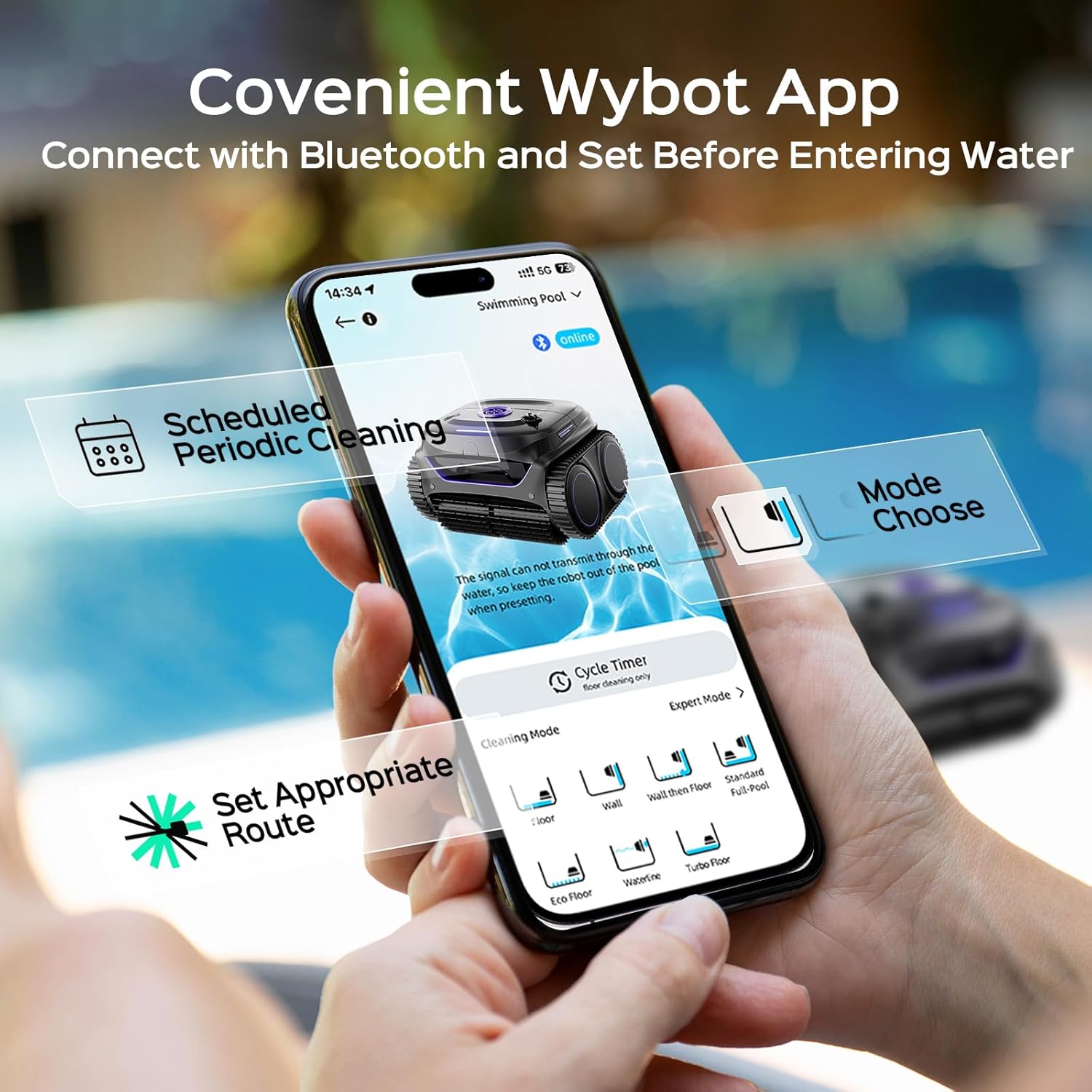 - 7 Mode Cleaning: With the App, you can choose any appropriate mode in “Waterline Only” “Wall Only” “Floor Only” “Standard Full Pool” “Turbo Floor” “Eco Floor” “Wall then Floor”. Overall choices suit for various usage scenario