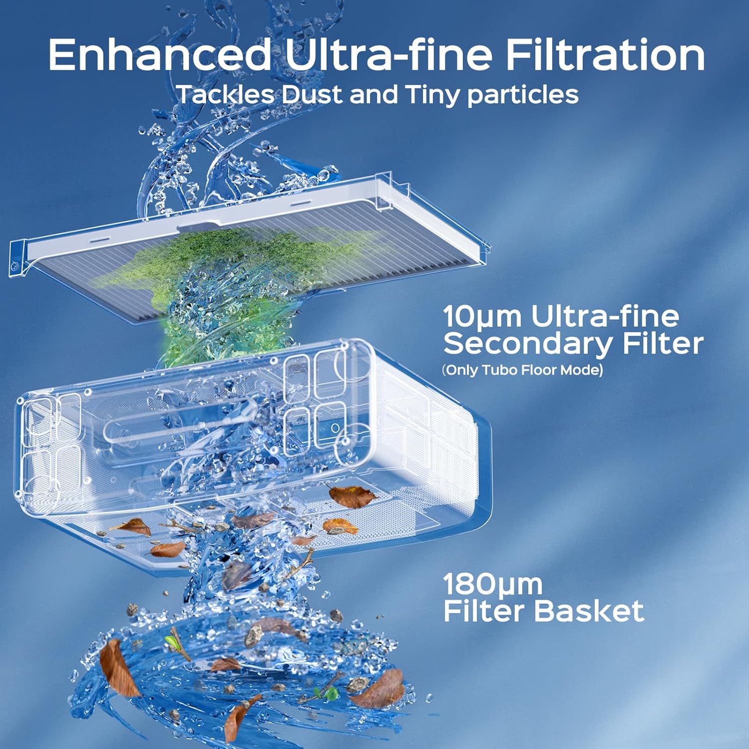 - Ultra-Fine Dual-Layer Filtration: To thoroughly remove fine particles such as green algae, dust, and sand, you can install a 10-micron ultra-fine HEPA filter as a secondary filter in “Turbo Floor” mode