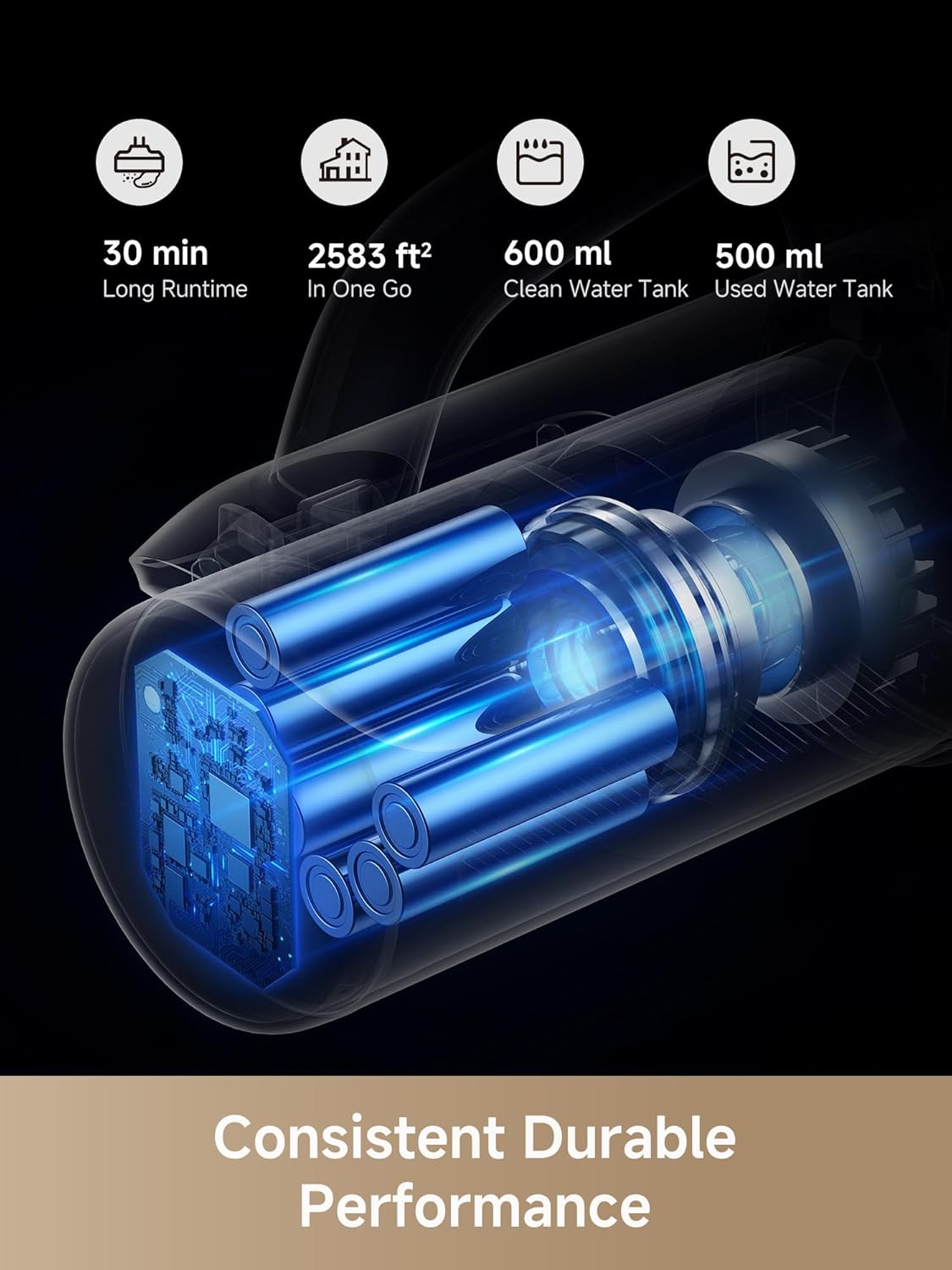 - 【18,000Pa Suction】Delivering an outstanding 18,000 Pa of suction power, K30 skilfully manages wet and dry messes through 500 RPM rapid mopping while ensuring quiet operation.