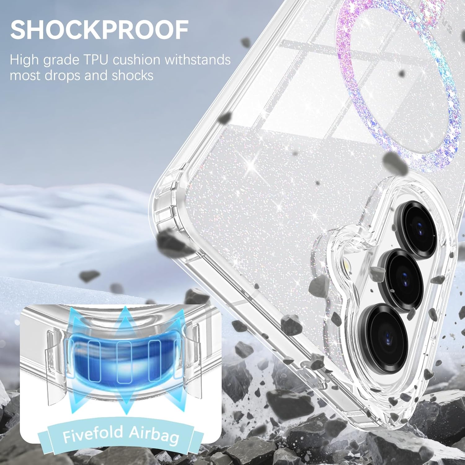 Glitter Design: The transparent glitter back cover shows off the beautiful design and the logo of your phone. The embedded crystal glitter will never peel off and stay shiny, giving your case a long-lasting clear glitter. Built-in magnetic ring can strengthen the wireless charging.